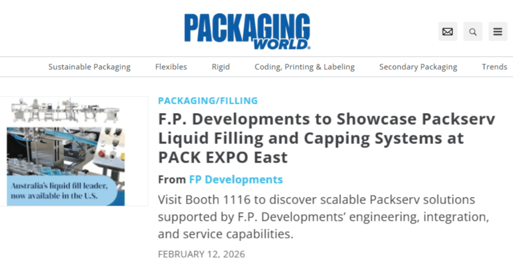 Read the original article: https://www.packworld.com/rigid/filling-capping-closing/product/22960517/fp-developments-fp-developments-to-showcase-packserv-liquid-filling-and-capping-systems-at-pack-expo-east