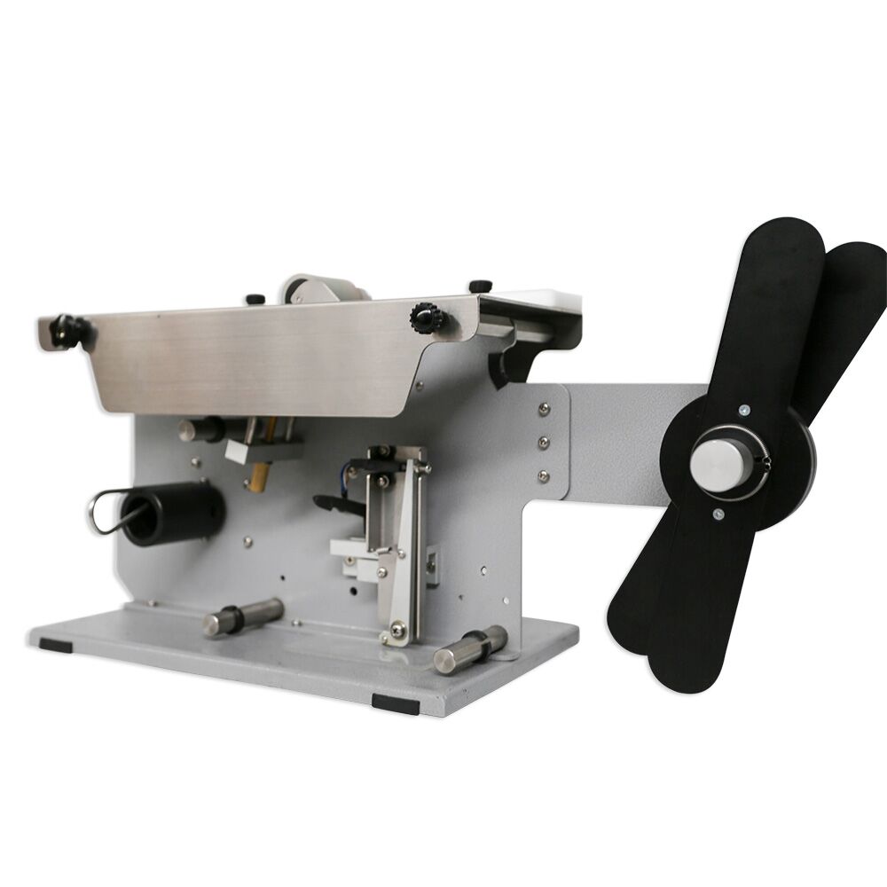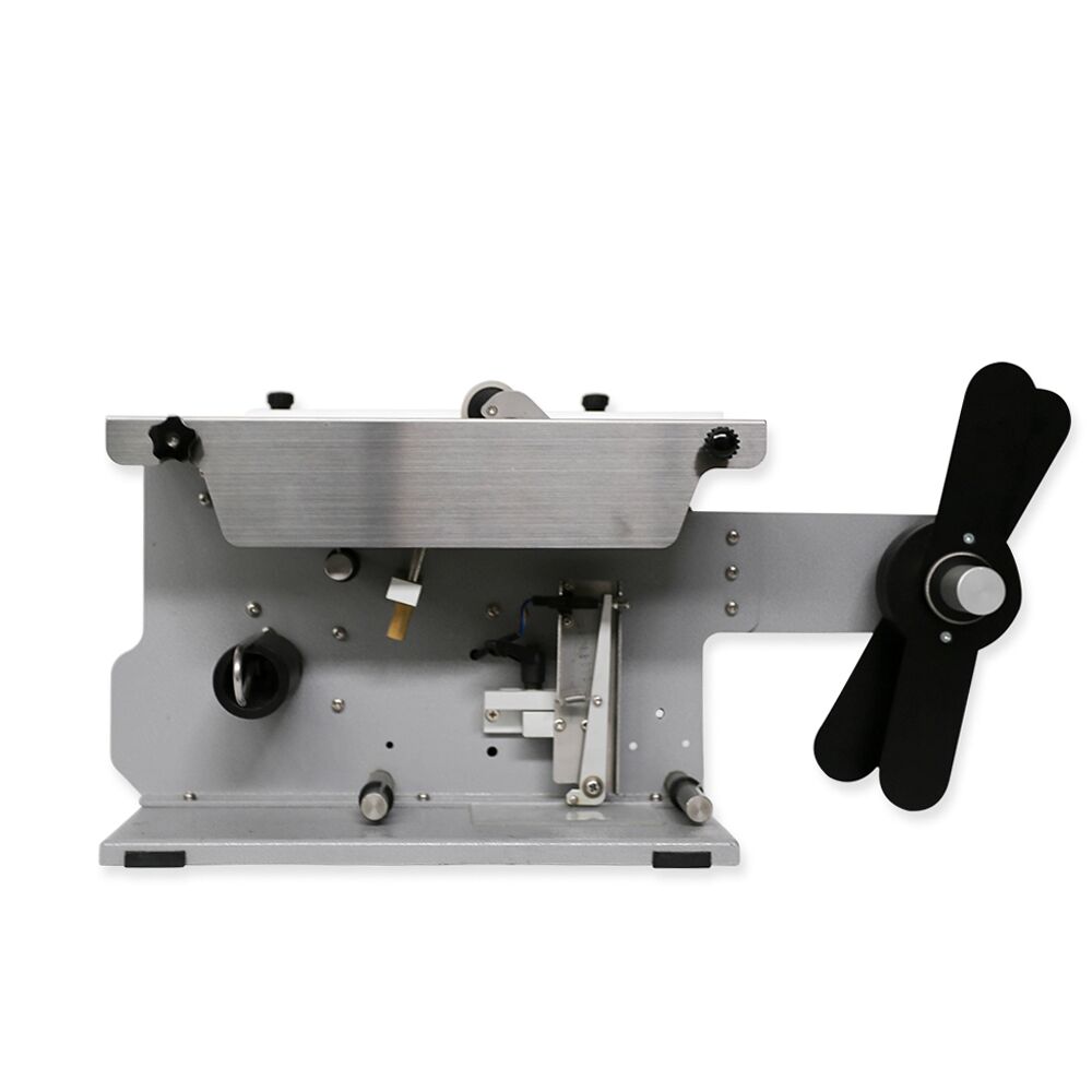 This machine is manually operated by swiping the carton over the top plate whilst a white nylon guide provides positioning of the carton. The label is fed out electrically; when the carton comes in contact with the application roller the label is applied to the front face of the carton and the underside, while the backing paper is being rolled up automatically.