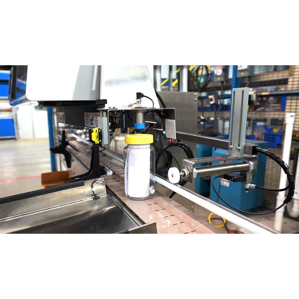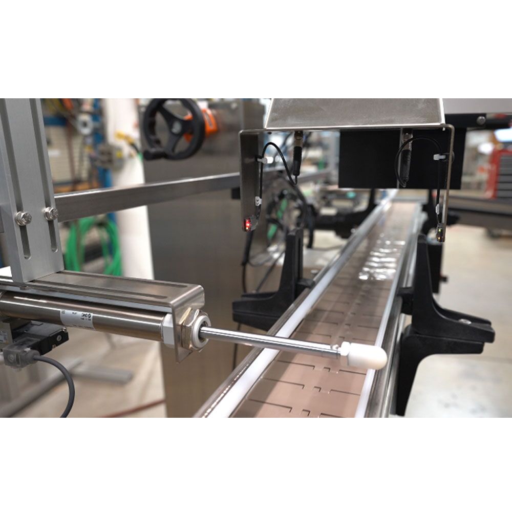 Packserv’s Pneumatic Reject Device, developed by Pillar, complements the Bottle and Cap Detection System by actively removing faulty bottles from the conveyor.  Equipped with two photoelectric sensors, an air-actuator “kicker”, and a reject tray for collecting defective bottles, this system ensures any products with missing foils, crooked caps, or stalled bottle faults are efficiently removed from the production line before they reach the final stages.