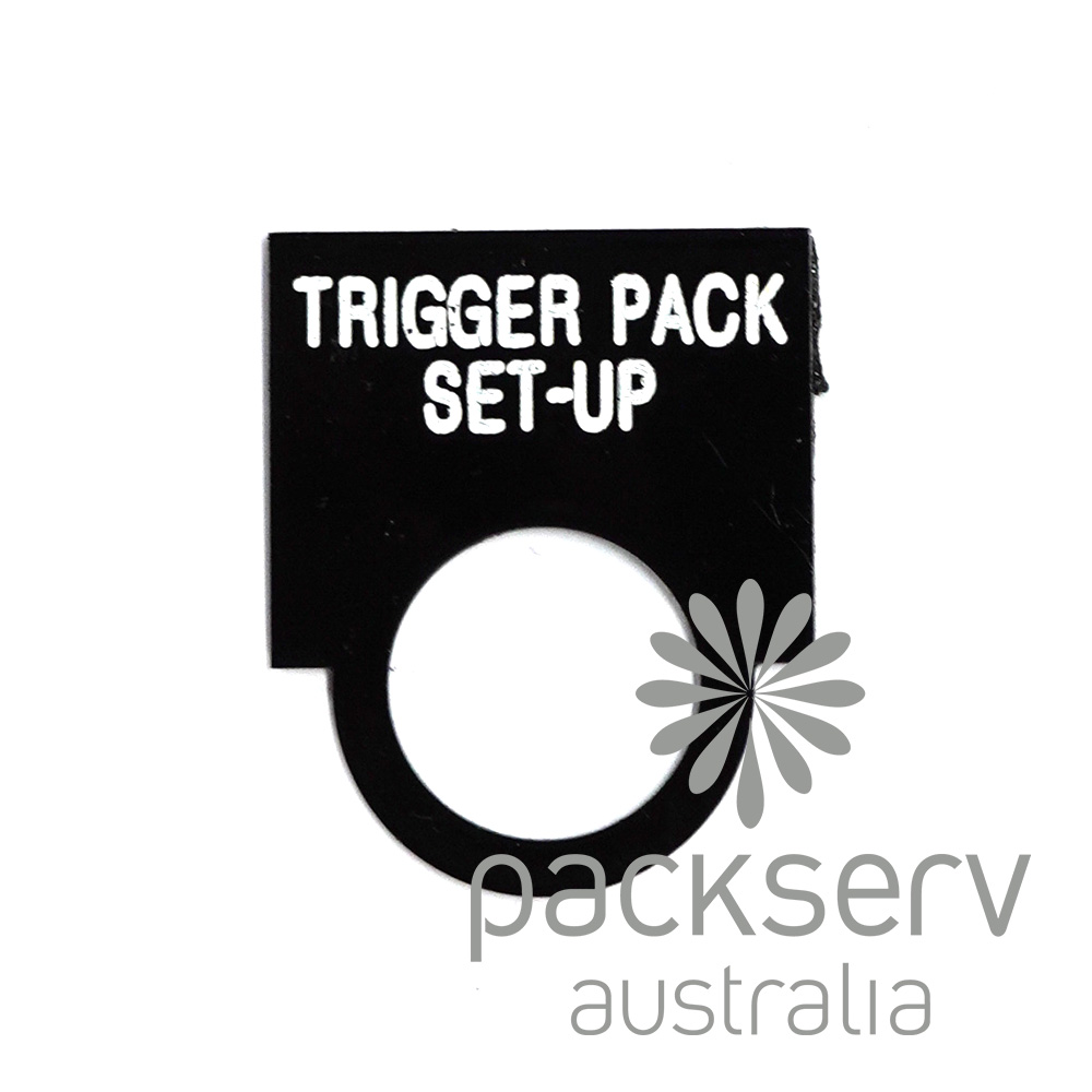 The Pump Tite (Trigger Pack) Set Up Label Plate is a durable steel label applied to relevant Automatic Cappers. This indicates a button or setting control used to initiate trigger pack functions in capping bottles or containers. This important control element regards capping adjustments when applied to machines with this capability.