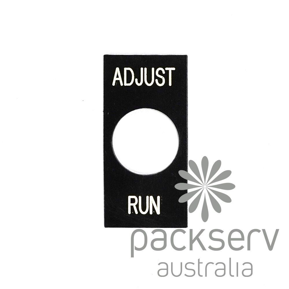 The Square Plate Adjust Run is a durable steel label applied to machinery, accurately indicating adjust & run switch. This important control element regards adjusting the position of compatible components when applied to a machine, and running the machine in such position.