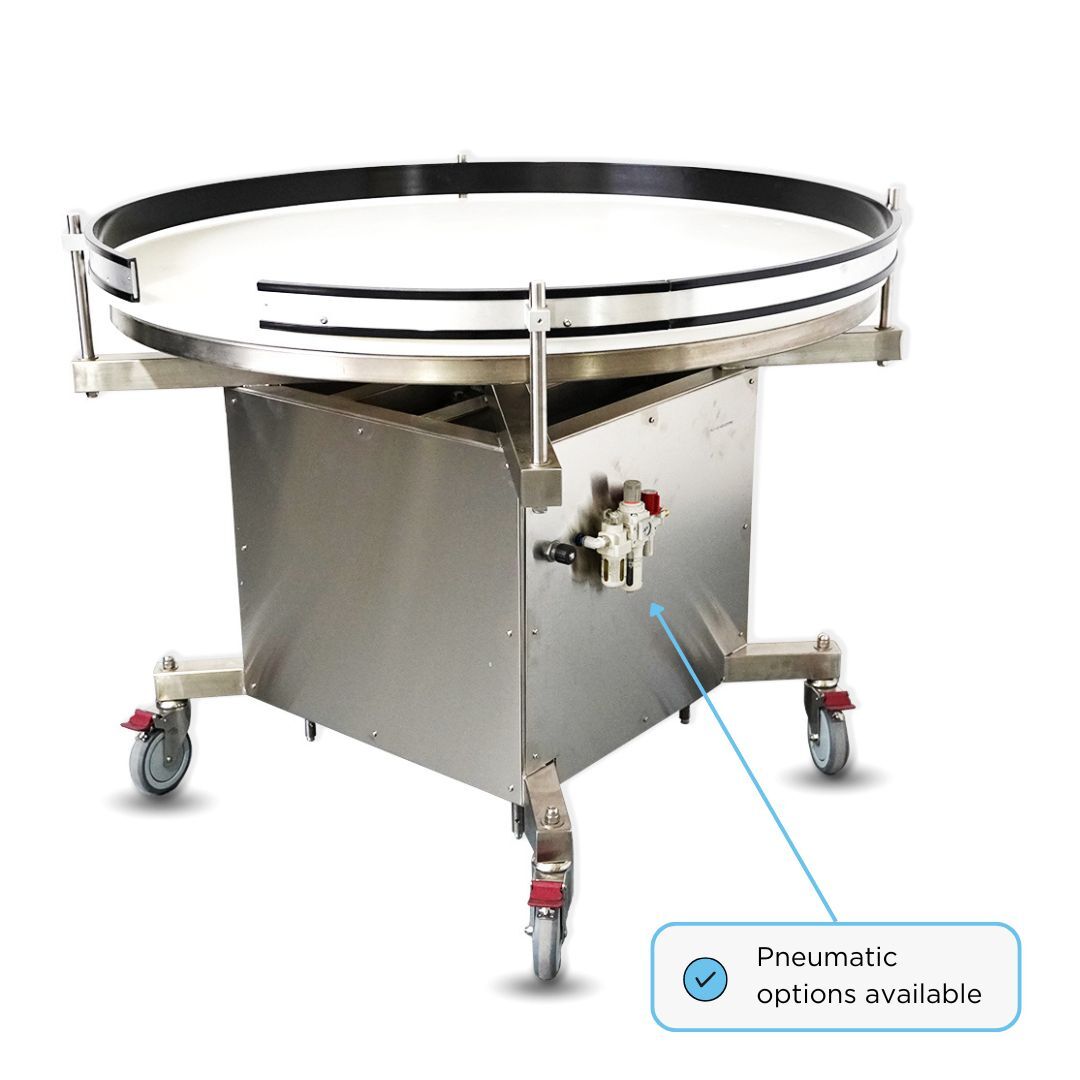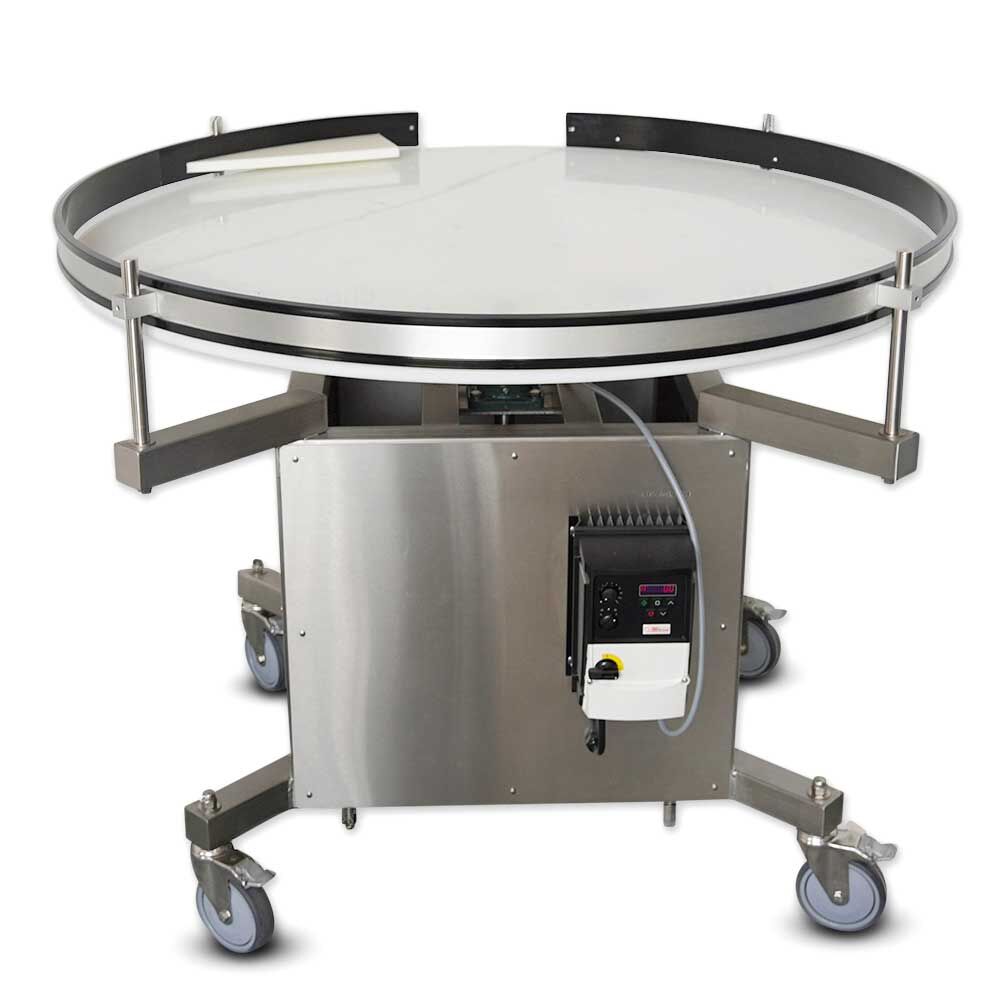 The Packserv PAT-8 Accumulation & Outfeed Table is engineered to streamline your production line by reducing the number of operators needed for loading and packing. Designed with a large circular tabletop, it efficiently collects containers at the end of the conveyor line, allowing for smooth and organised pack-off into cartons.