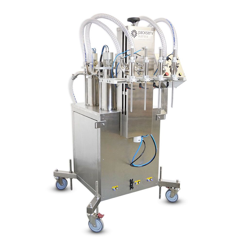 The Packserv PFM-4C Four Head Auto Filler is an automatic liquid and lotion filling machine with four independent filling nozzles each capable of dispensing up to 2 litres per stroke. Built as a heavy-duty, fully pneumatic in line bottom-up filler, it delivers reliable performance with easy operation, tool free cleaning, and quick, easy changeovers.