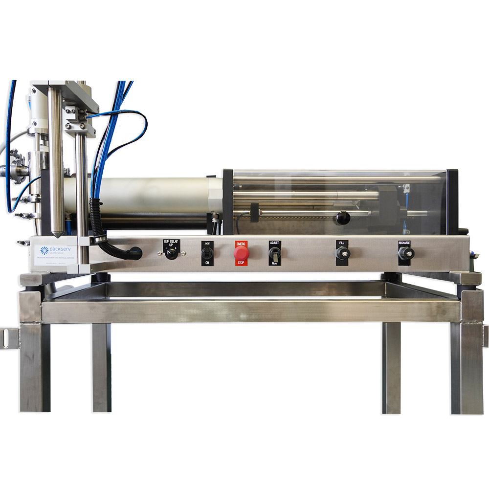 The stroke adjuster and air/product cylinder drive assembly is enclosed with a safety interlocked poly-carbonate cover, stopping the machine if opened by operator.