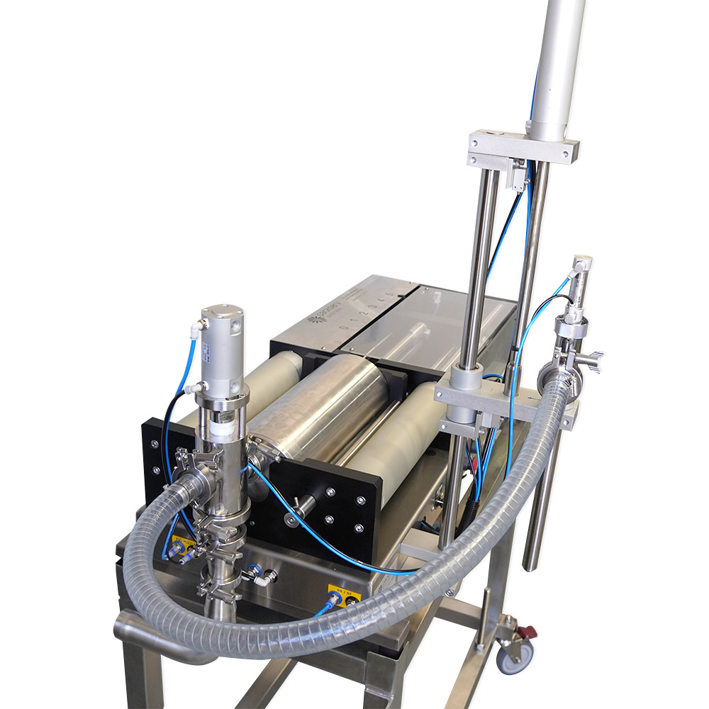 The PFM-5-BUF also comes standard with positive shut-off nozzle and a bottom up fill assembly. The spool-valve system of the filler handles all types of bottling products. It is capable of processing thin liquids, to creams and thick pastes as well as hot and cold filling. This equipment can handle temperatures of up to 95°C (203 F) with ease.