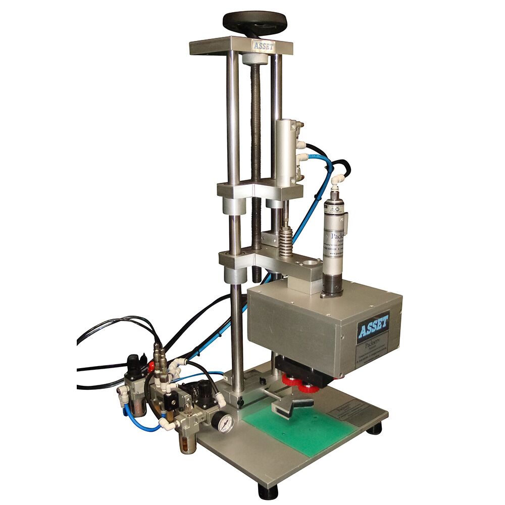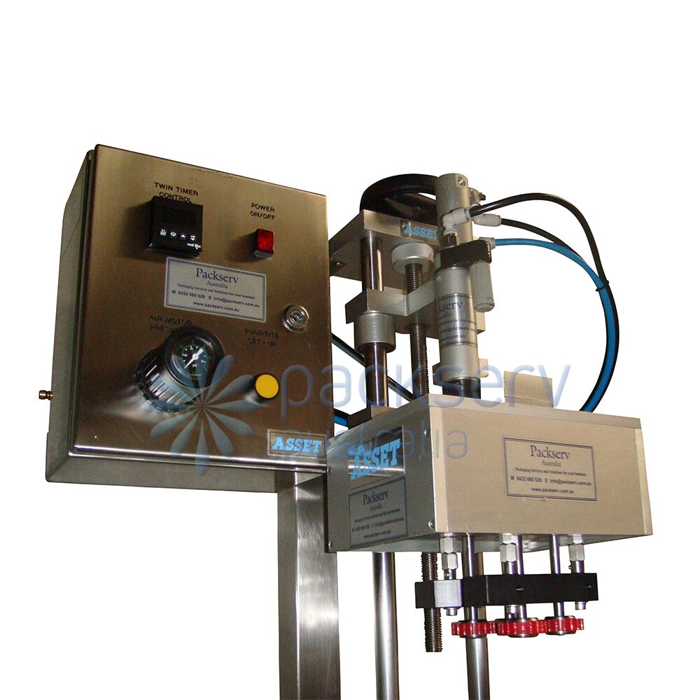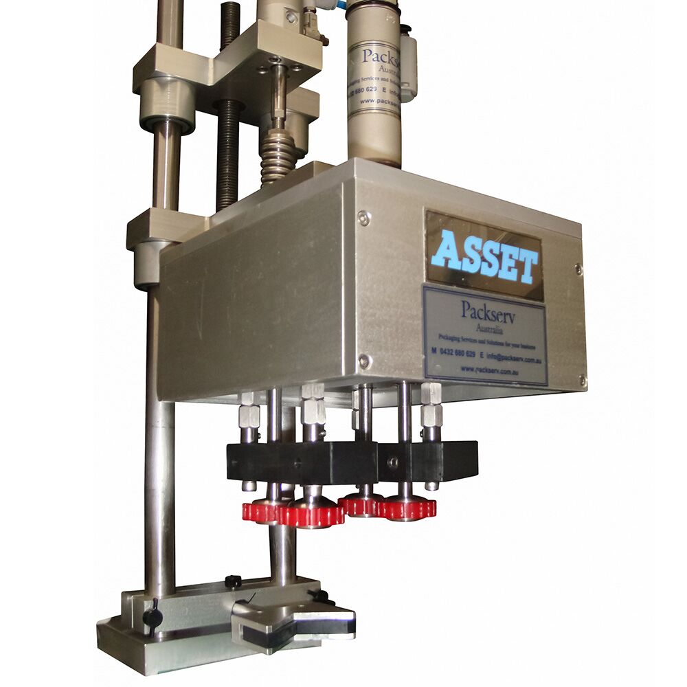 The PT-7 Asset Packaging Machine Pumptite unit is an ancillary unit designed for use with either the AC-1 or PCM-1 series of cap tighteners. This machines allows the tightening of non-standard closures such as trigger-packs, spray-bottles and cream-dispensing pump bottles.